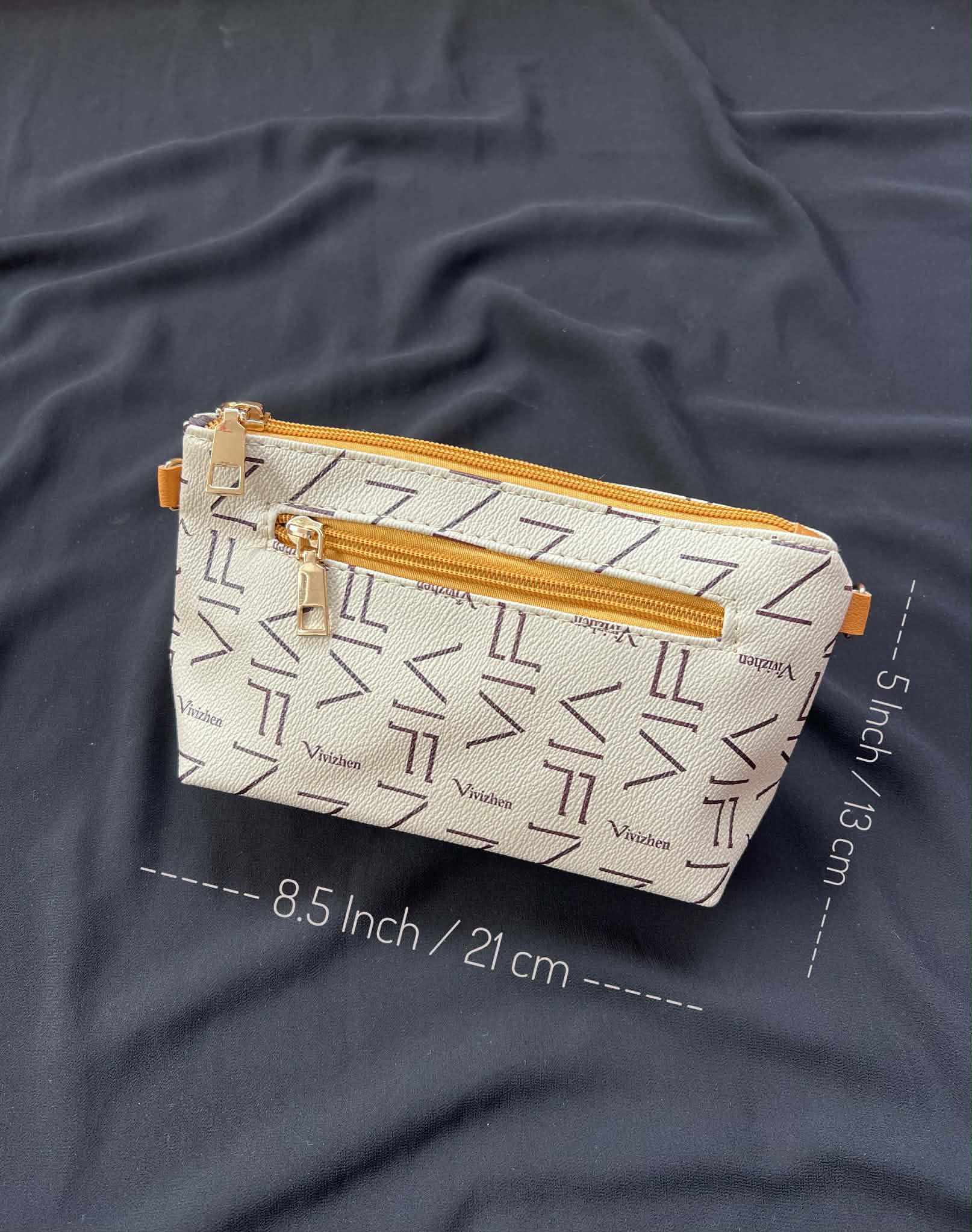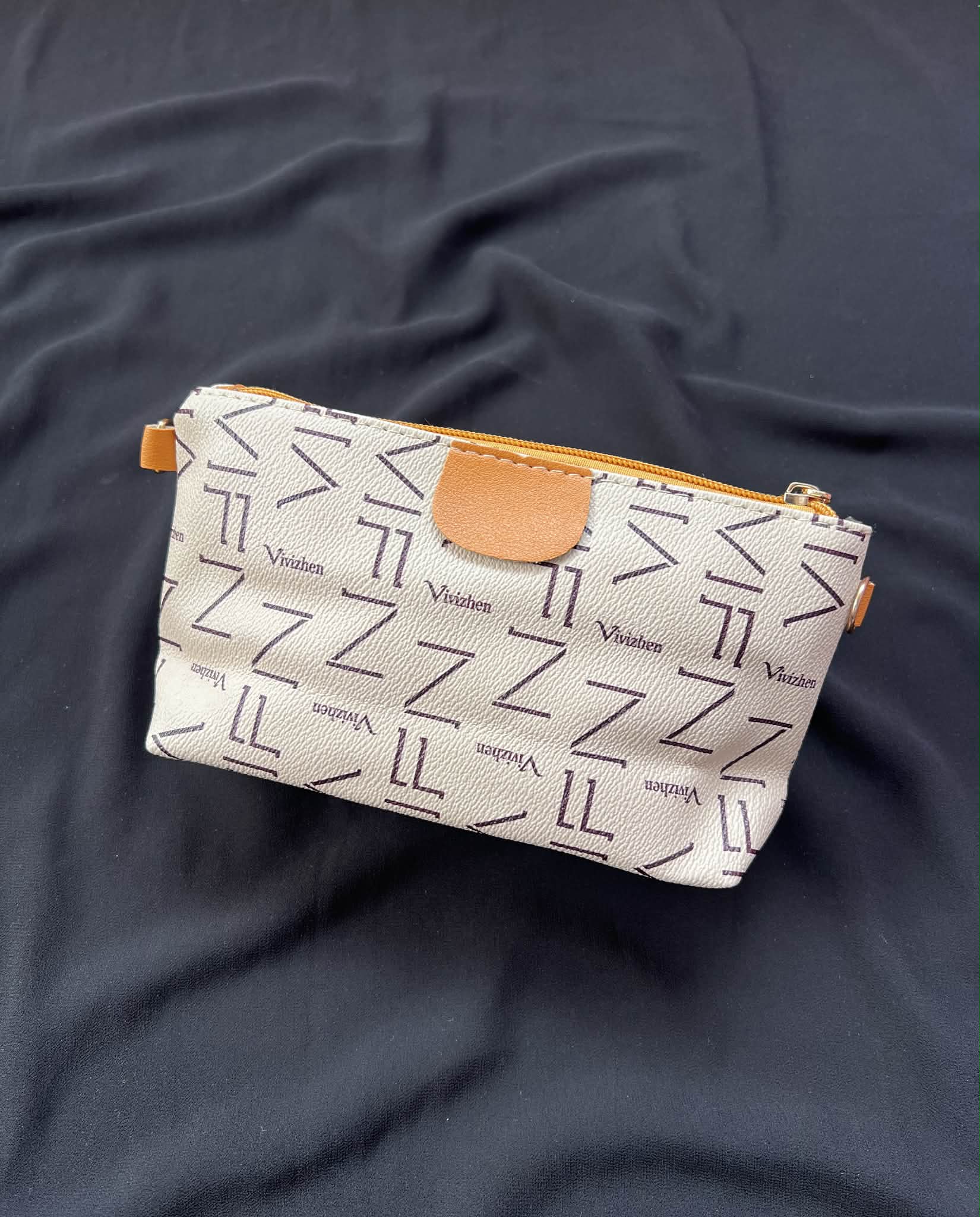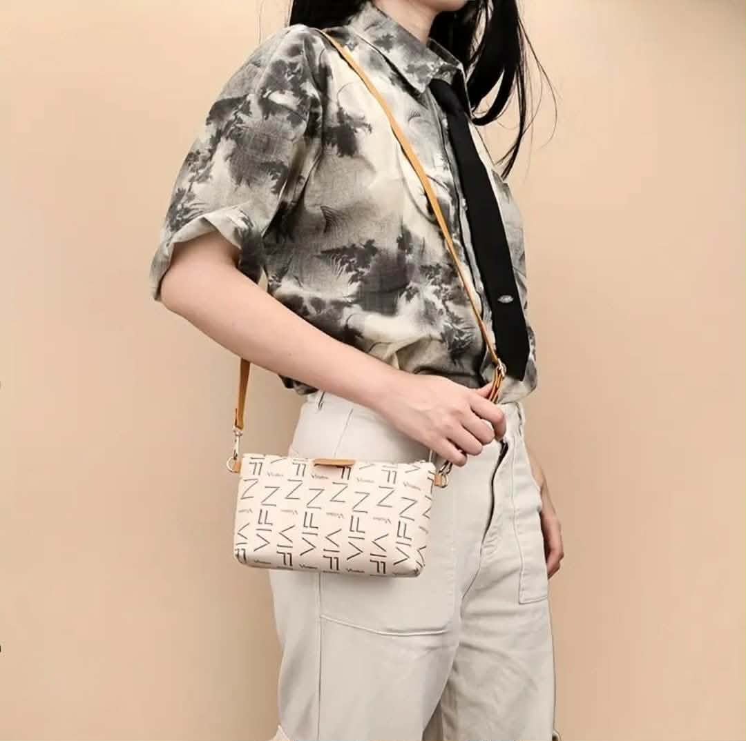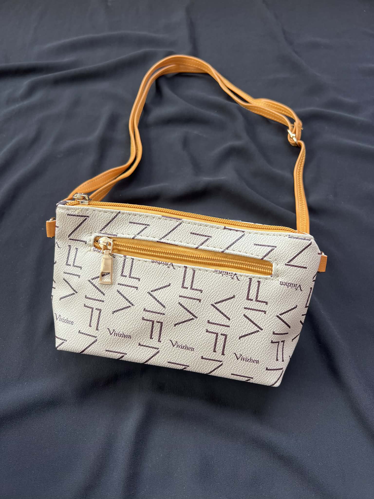 Crossbody bag imported from China, featuring a cream geometric pattern with a contrasting mustard shoulder strap ⚜️